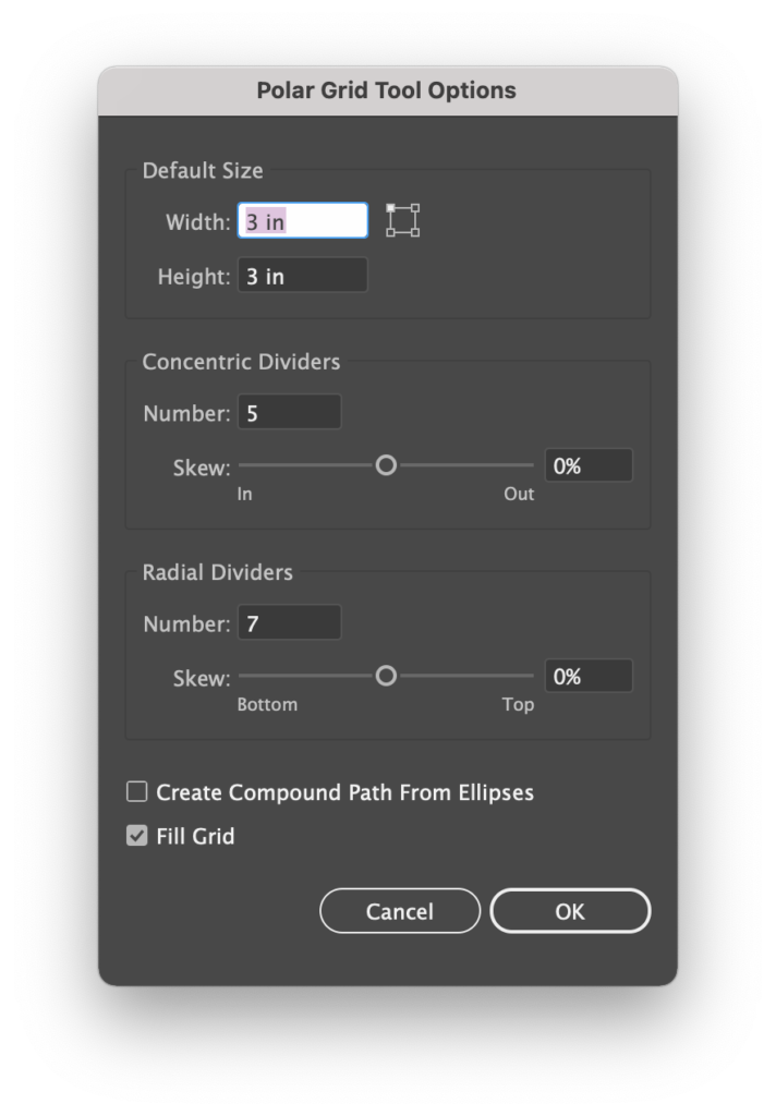 In the window, select the number of rings and segments you’d like. Check Fill Grid to fill the shapes with your fill/stroke colors.