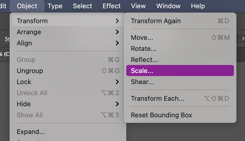 We need to make sure the line segments cross the outer ring, so we’re going to scale it to extend beyond the edge of those rings. With the line segement group select, click Object in the menu, then Transform, and then Scale.
