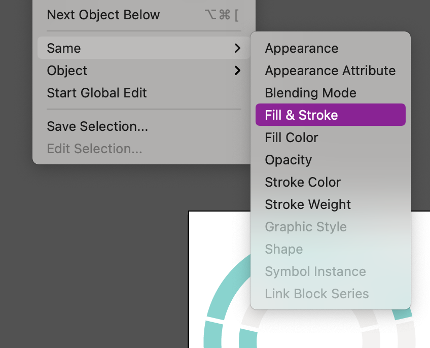 Now, deselect and click on one of the ring segments. You’ll see they are now all their own separate shape! We did it! To clean up, slick on one of the ring segments and use the Select menu to select all the same shapes.